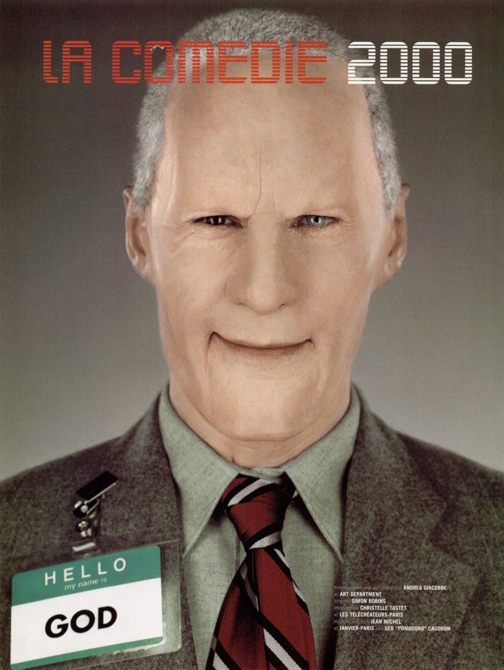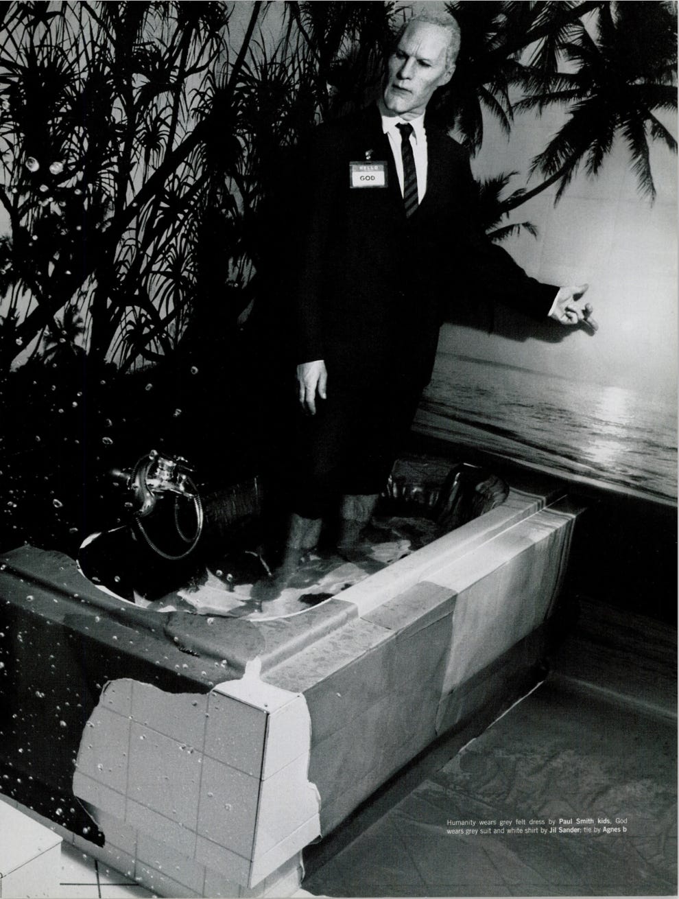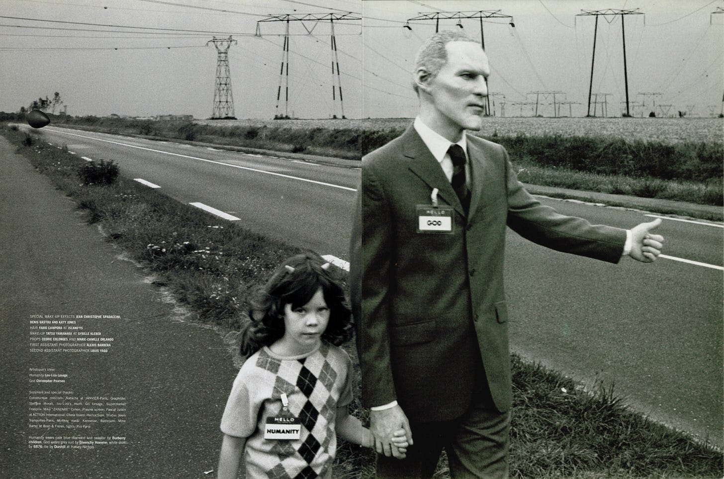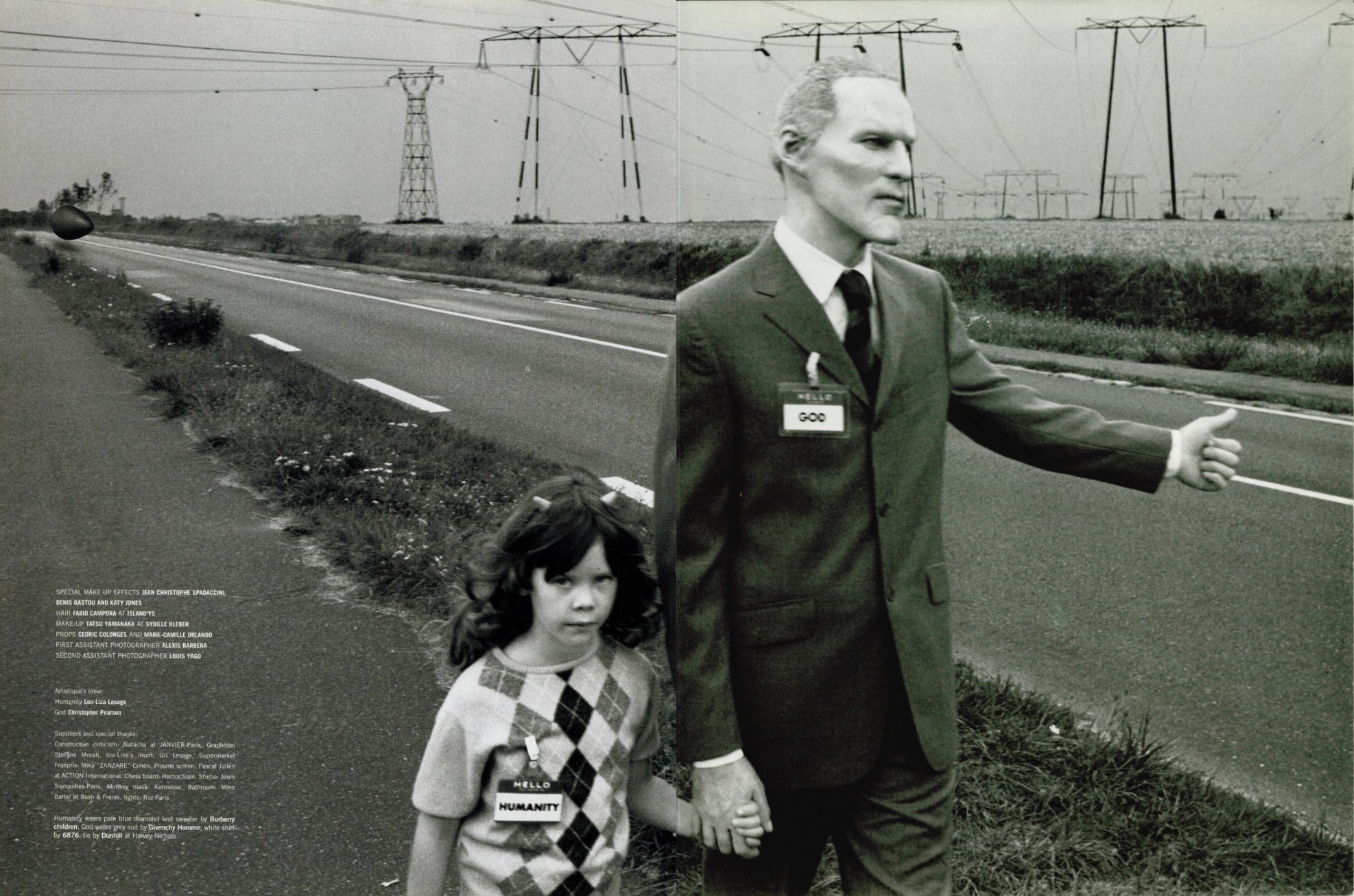 For the December 1999 issue of Dazed & Confused, he produced La Comédie 2000: a surrealist narrative featuring two characters, a man in a prosthetic old-age mask wearing a name badge reading “GOD,” and a young girl with devil horns wearing one reading “HUMANITY.” Together they move through a sequence of scenes, playing chess against chimpanzees, shopping in supermarkets, standing in bathtubs, hitchhiking on empty roads, that flatten the sacred and the mundane into the same visual register.
