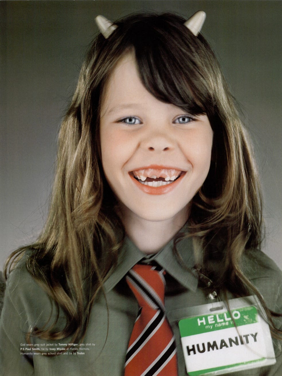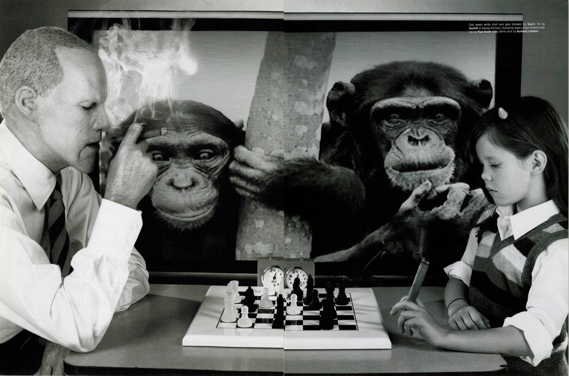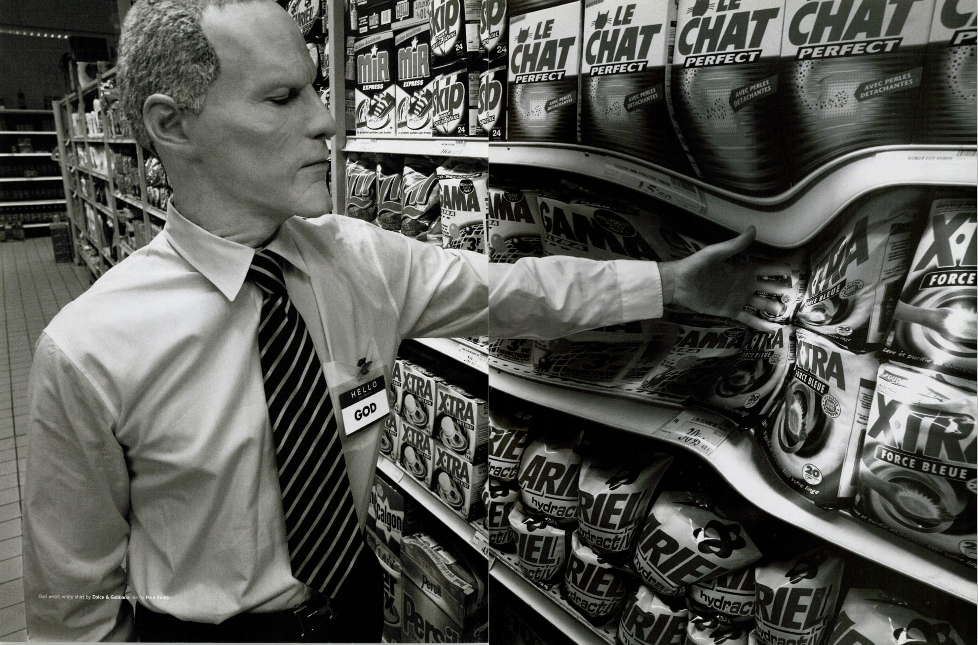 For the December 1999 issue of Dazed & Confused, he produced La Comédie 2000: a surrealist narrative featuring two characters, a man in a prosthetic old-age mask wearing a name badge reading “GOD,” and a young girl with devil horns wearing one reading “HUMANITY.” Together they move through a sequence of scenes, playing chess against chimpanzees, shopping in supermarkets, standing in bathtubs, hitchhiking on empty roads, that flatten the sacred and the mundane into the same visual register.