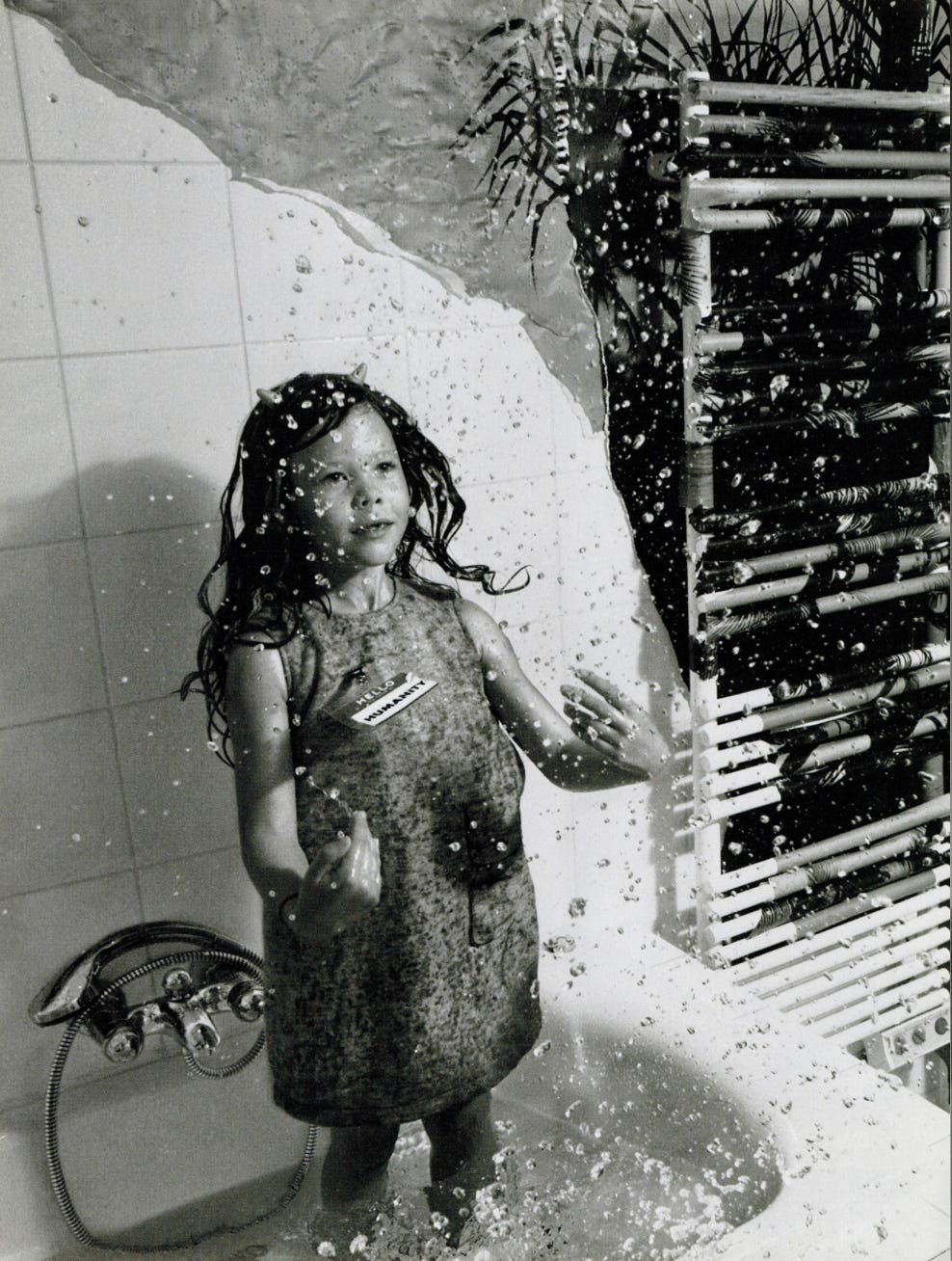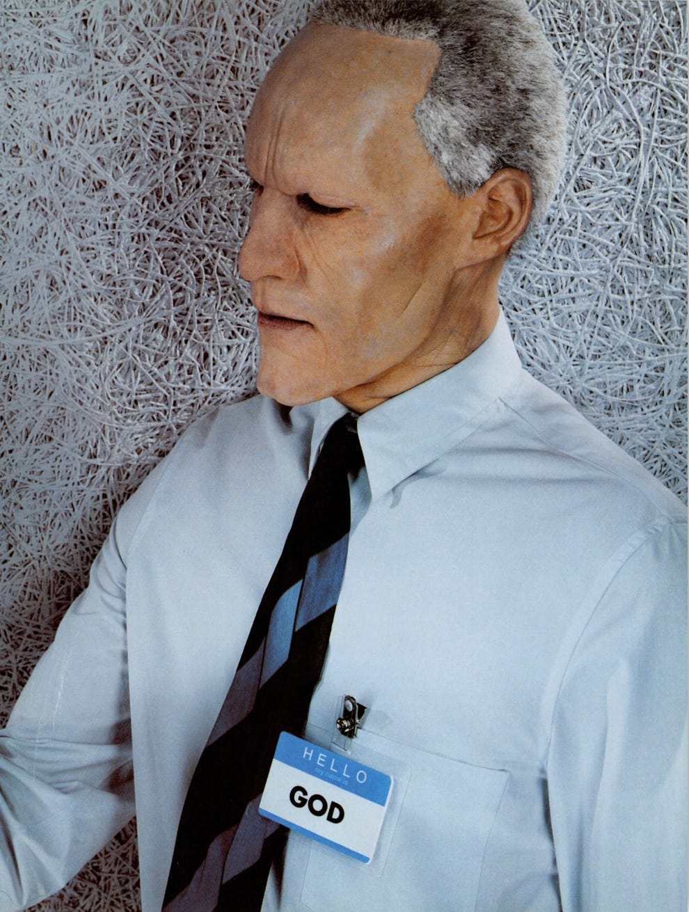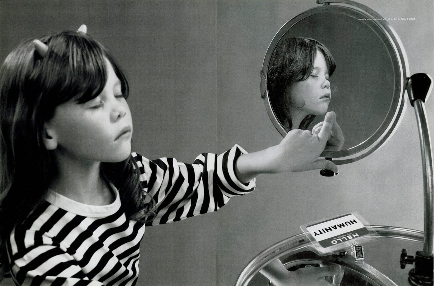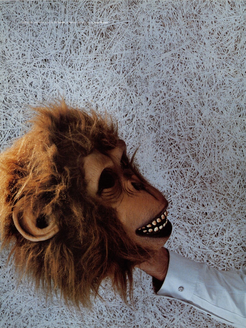 For the December 1999 issue of Dazed & Confused, he produced La Comédie 2000: a surrealist narrative featuring two characters, a man in a prosthetic old-age mask wearing a name badge reading “GOD,” and a young girl with devil horns wearing one reading “HUMANITY.” Together they move through a sequence of scenes, playing chess against chimpanzees, shopping in supermarkets, standing in bathtubs, hitchhiking on empty roads, that flatten the sacred and the mundane into the same visual register.