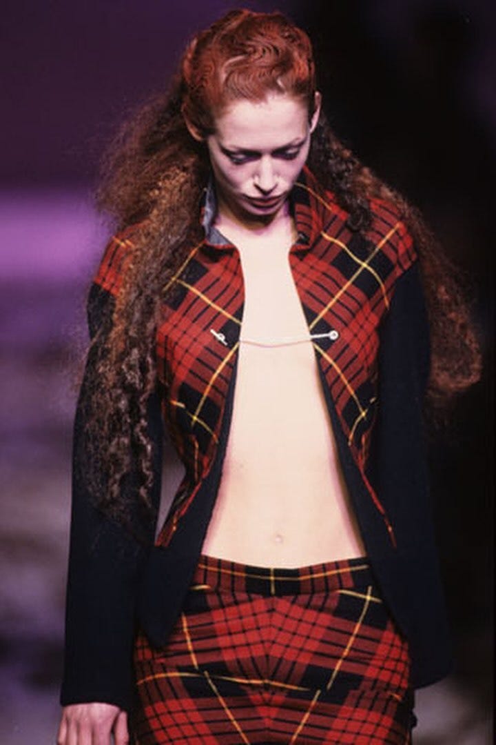 It also, paradoxically, legitimised the use of historical and political trauma as narrative material in fashion, not only by resolving the tension, but also by demonstrating that fashion was capable of containing it. Designers throughout the late 1990s and 2000s began working more openly with themes of violence, displacement, and cultural loss. Some did it with more contextual care than McQueen managed here. Others did it with considerably less.